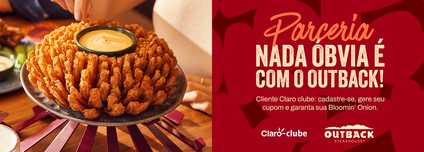 Imagem meramente ilustrativa. Ganhe uma Bloomin' Onion na compra de um prato principal ou aperitivo. Esta oferta é pessoal e intransferível, válida por 30 dias a partir da geração do cupom. Da abertura ao fechamento dos restaurantes. O voucher não poderá ser trocado por outro produto nem ter o seu valor utilizado como crédito para fins de desconto e nem ser convertido em dinheiro ou utilizado de forma parcial. A cortesia deve ser consumida no próprio restaurante e não é válida para Delivery e pedidos para viagem. Cortesia não cumulativa com outras promoções, Lunch Menu/Menu Almoço e Happy Hour/Billabong Hour, sendo admitida apenas uma utilização por mesa. Valido em todos os restaurantes Outback Brasil. Venda proibida.