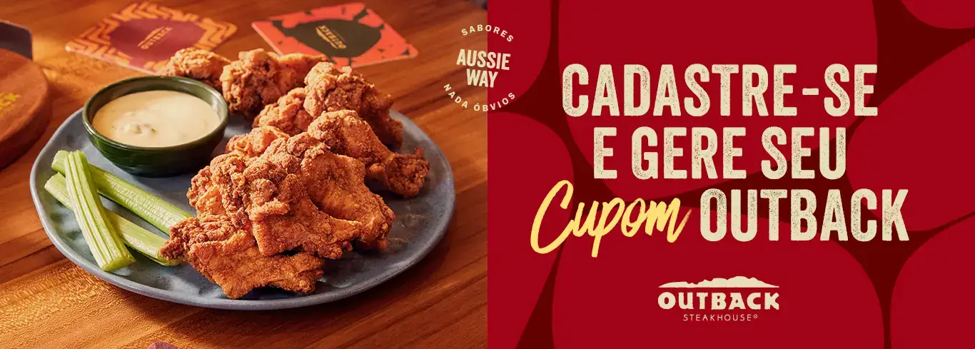 Imagem meramente ilustrativa. Oferta pessoal e intransferível, válida até 31/01/2026, mediante a compra de um prato principal ou aperitivo. Promoção não cumulativa com outras ofertas. Esta cortesia não poderá ser trocada por outro produto nem ter o seu valor utilizado como crédito para fins de desconto, devendo ser consumida no próprio restaurante. Não é válido para Delivery e pedidos para viagem. É reservado ao Outback o direito de alterar, suspender ou cancelar esta oferta a qualquer momento, sem aviso prévio. *Será admitida apenas uma utilização por CPF e por mesa.